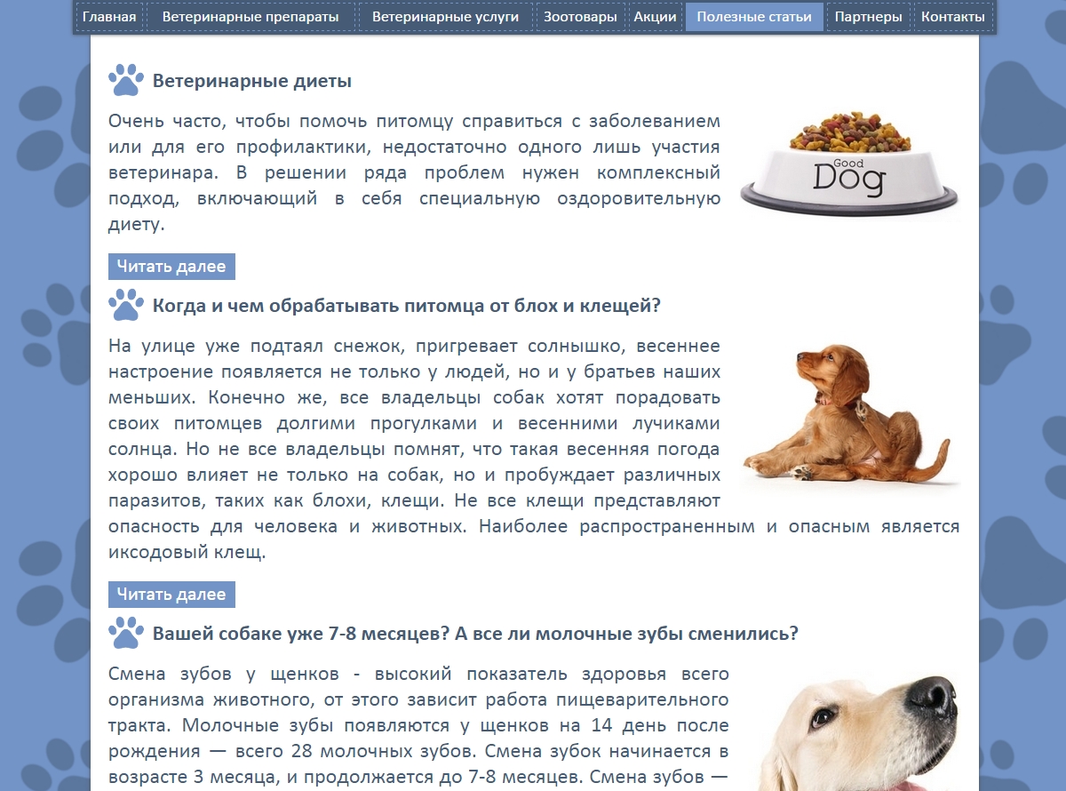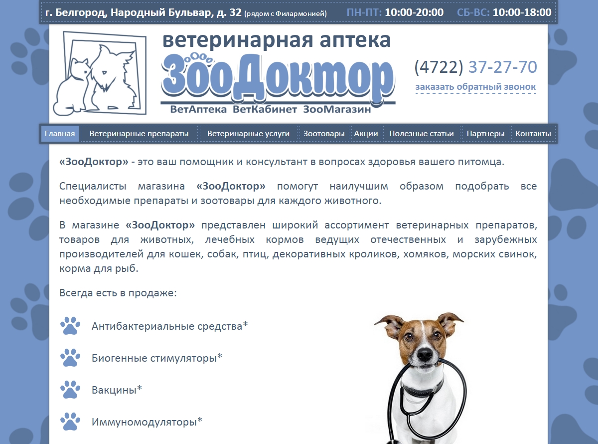 Необходимо было разработать сайт для ветеринарной аптеки в Белгороде. Цветовая схема была подобрана исходя из логотипа.