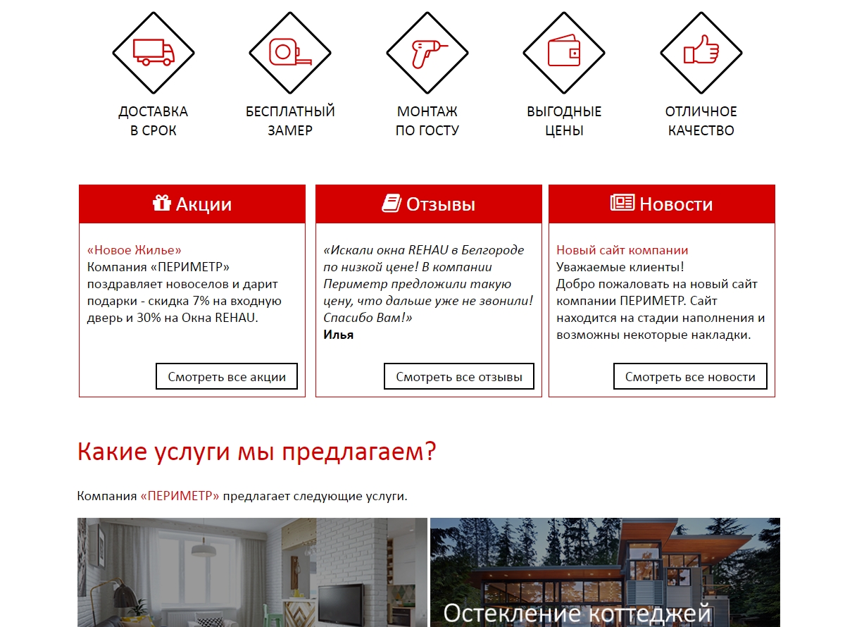 Необходимо было создать сайт для торговой компании, специализирующейся на продаже пластиковых окон. На сайте представлены услуги компании, контактная информация, портфолио, а также новостная лента. Для удобства посетителей присутствует оконный калькулятор.