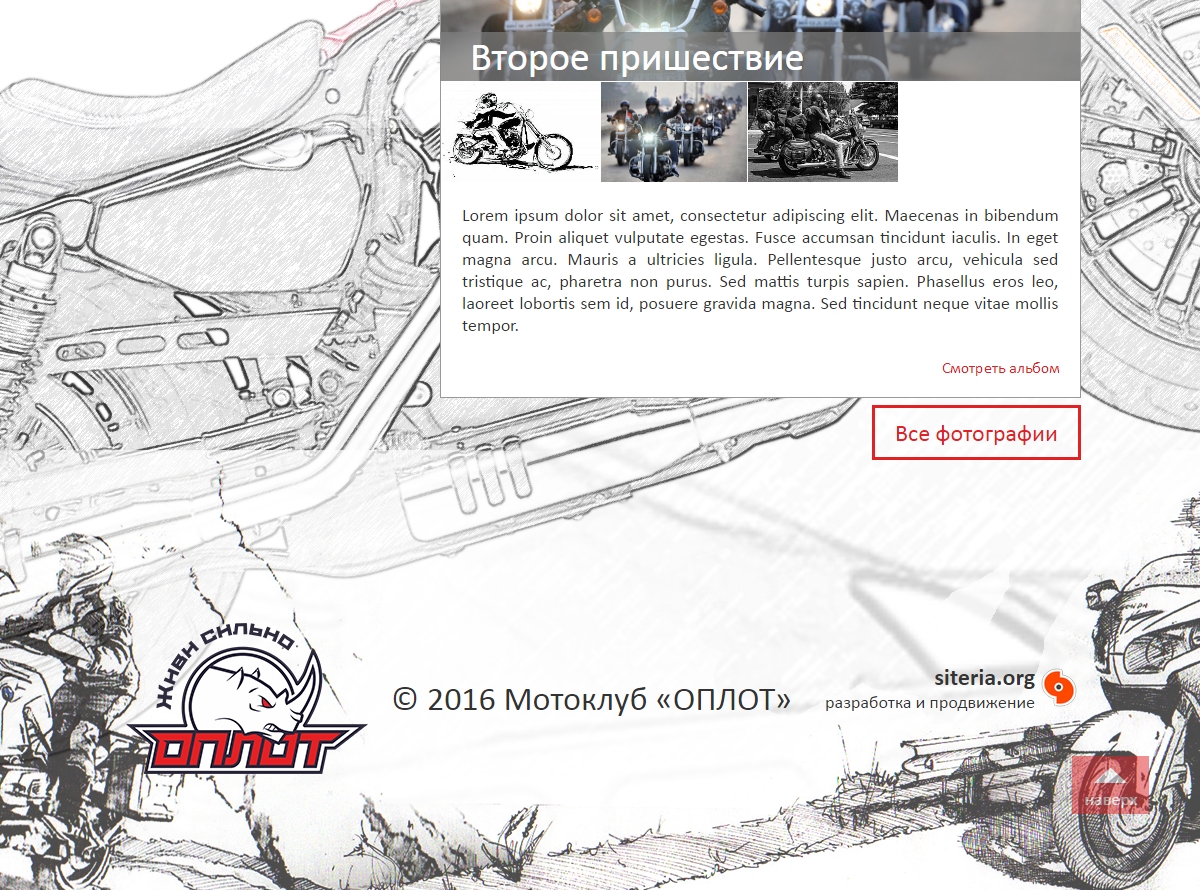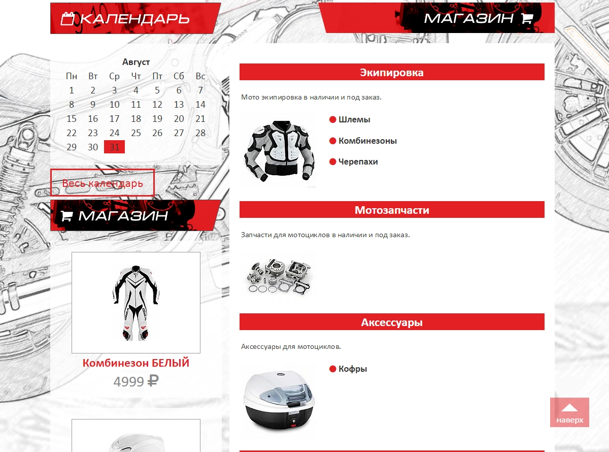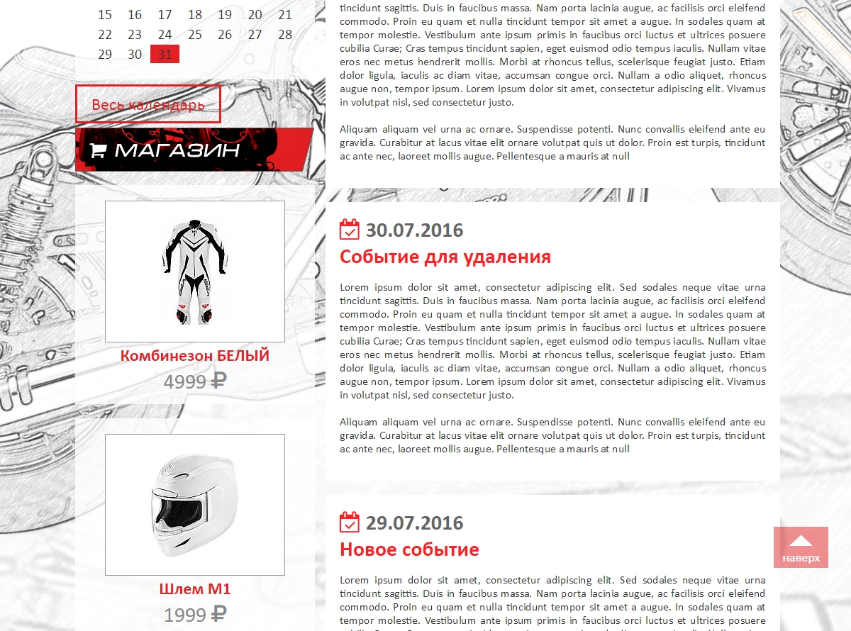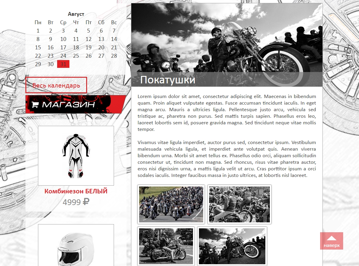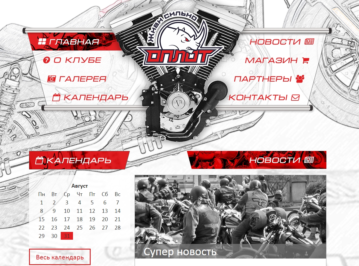 Необходимо было создать сайт для мотоклуба. Основная концепция - клубный сайт с календарем, мероприятиями и галереей. Дополнительно - магазин мотоаксессуаров и мотозапчастей.