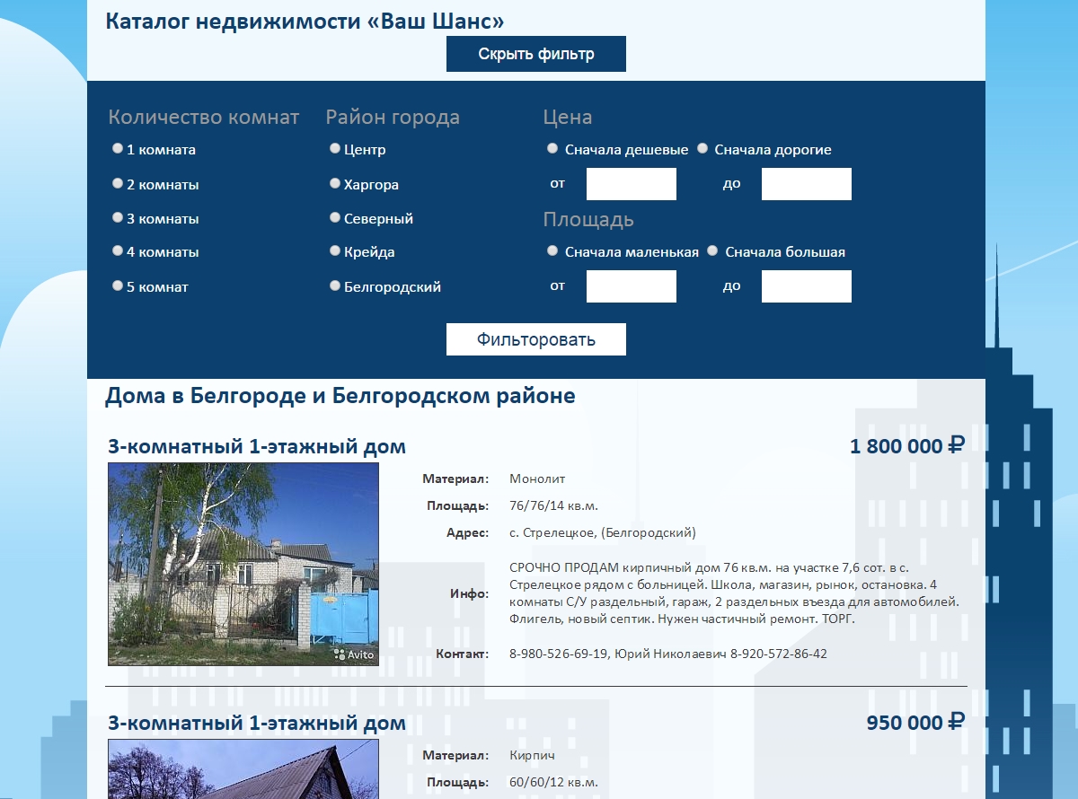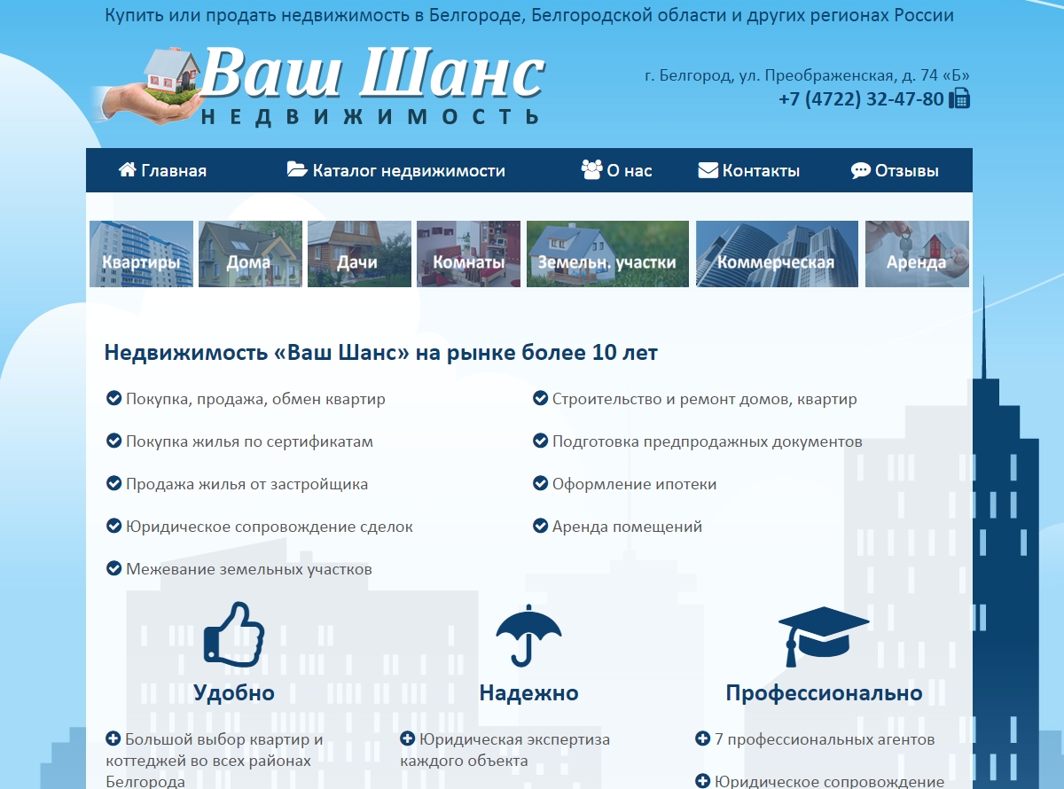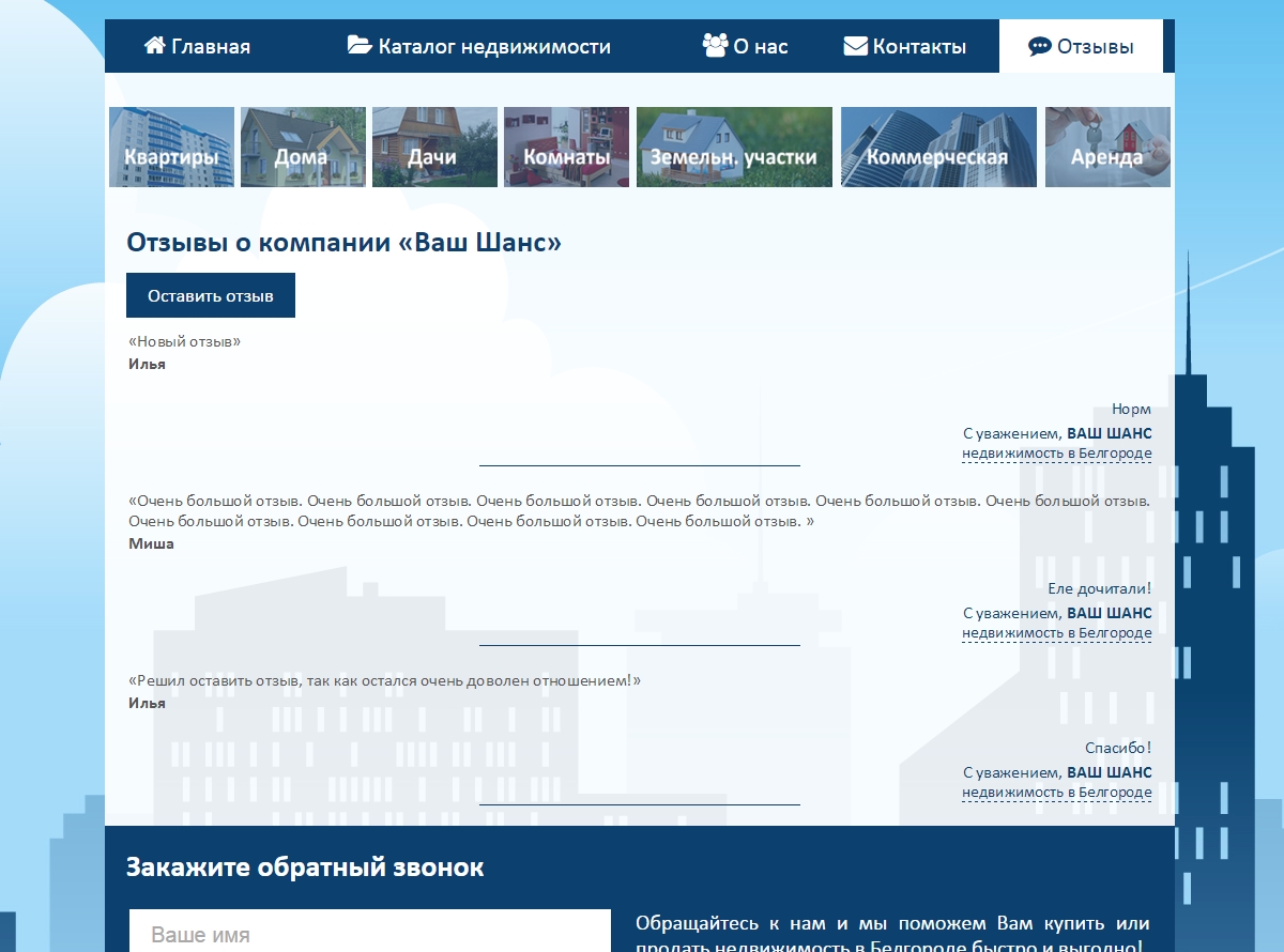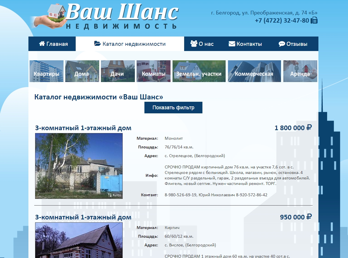 Необходимо было разработать сайт в Белгороде для агентства недвижимости. Панель администрирования, отзывы, расширенный фильтр поиска объектов недвижимости.