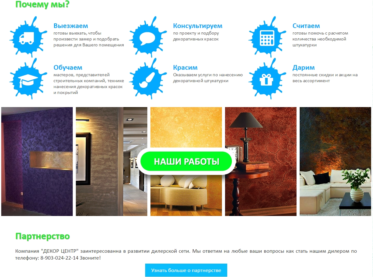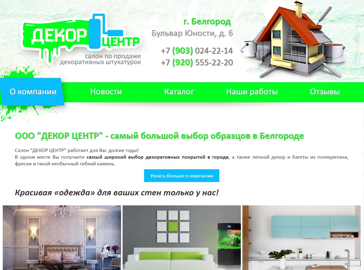 Необходимо было создать сайт для торговой компании, основная сфера деятельности которой - декоративная штукатурка. На сайте присутствует каталог продукции в виде галереи изображений, а также новостная лента компании. Присутствует портфолио и страница с отзывами.