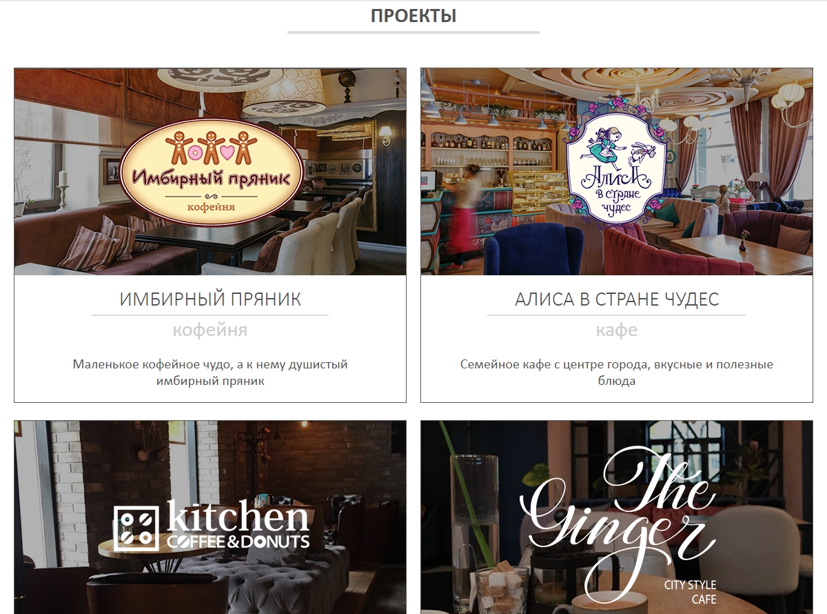 Основная задача - разработка сайта для сети кафе-ресторанов. Сайт содержит список проектов компании с подробным описанием каждого заведения. Сайт управляется через панель администрирования.