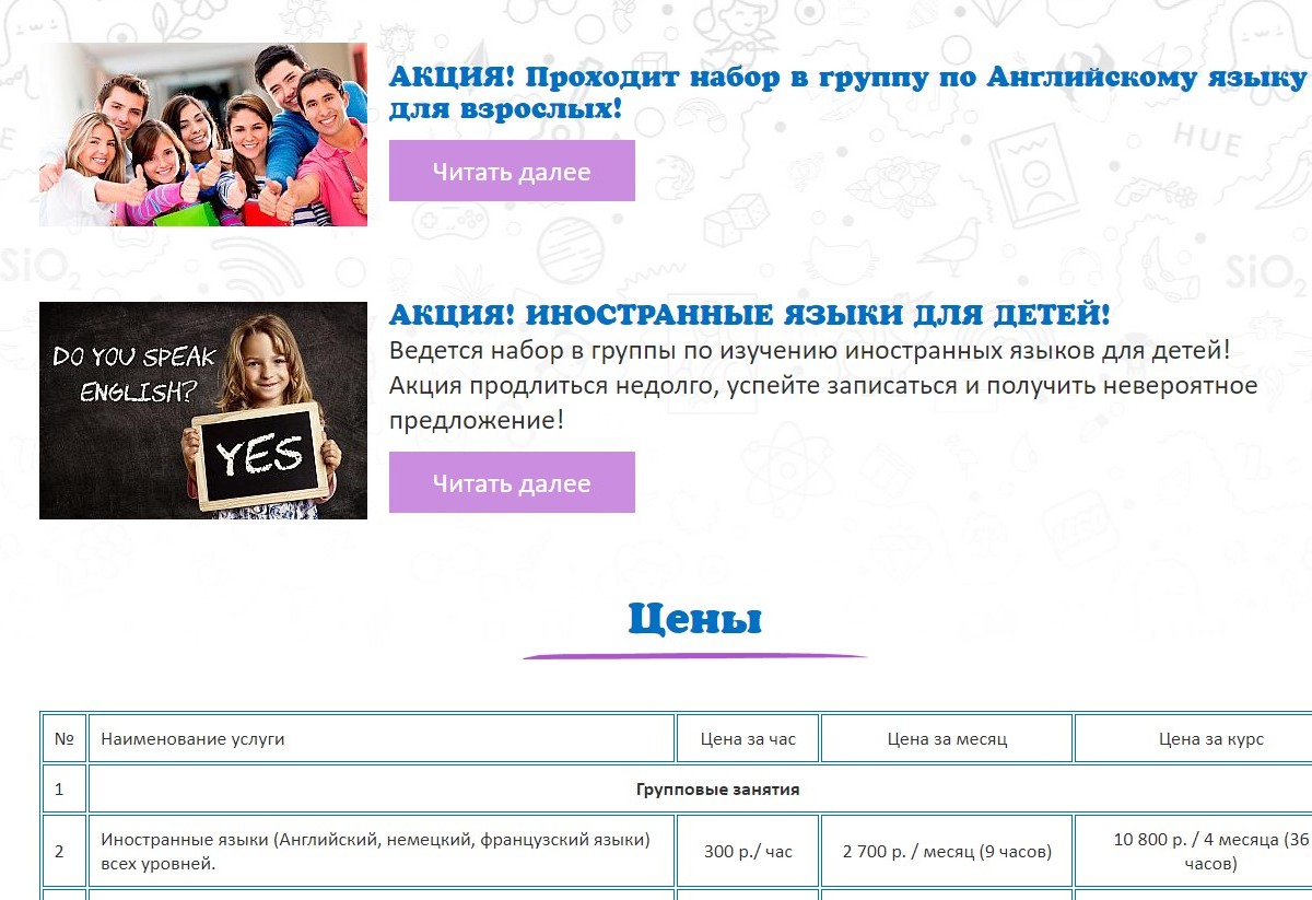 Создание сайта для частной школы. В функционал входит панель администрирования. Возможности - редактирование акций, таблицы стоимости услуг, обратная связь, отзывы с возможностью ответа, а также несколько слайдеров с возможностью редактирования через панель администрирования.